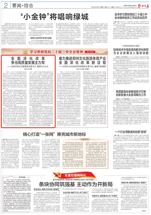 “黨的二十屆三中全會(huì)把深化國企改革納入進(jìn)一步全面深化改革戰(zhàn)略、推進(jìn)中國式現(xiàn)代化全局,為國有企業(yè)在新征程上改革轉(zhuǎn)型指明了前進(jìn)方向,明確了工作重點(diǎn)。”鄭州城市發(fā)展集團(tuán)有限公司黨委書記、董事長萬永生表示,城發(fā)集團(tuán)將以習(xí)近平總書記關(guān)于全面深化改革的一系列新思想、新觀點(diǎn)、新論斷和全會(huì)精神為指導(dǎo),通過戰(zhàn)略性重組和專業(yè)化整合,苦練“內(nèi)功”,筑強(qiáng)“筋骨”,爭當(dāng)中國式現(xiàn)代化建設(shè)鄭州實(shí)踐的主力軍。
