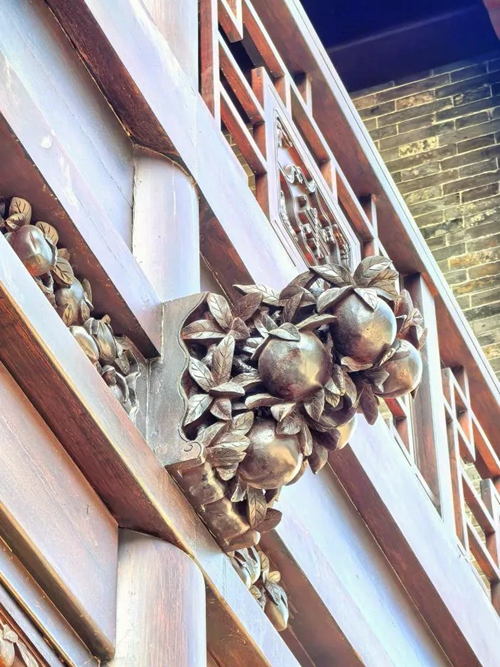 進(jìn)入北門,首先映入眼簾的是16號(hào)樓,其主題為壽桃,主題來源于信陽(yáng)鄧穎超祖居,祖居繡樓內(nèi)部裝飾有壽桃石雕,我們便選取此圖案進(jìn)行創(chuàng)作,在16號(hào)樓的墀頭、雀替、卡子花處均有精美的壽桃紋樣。