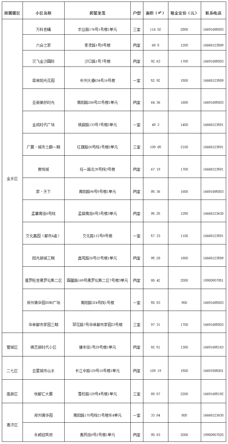 金水區(qū)15套配租房源所在小區(qū)包括萬(wàn)科世曦、六合之家、漢飛金沙國(guó)際、森林陽(yáng)光花園、亞新美好時(shí)光、金成時(shí)代廣場(chǎng)、廣廈·城市之巔一期、君悅城、家·天下、孟寨南街6號(hào)院、文化嘉園(都市A座)、陽(yáng)光新城三期、普羅旺世佛羅倫斯二區(qū)、鄭州清華園SOHO廣場(chǎng)、華林都市家園三期。