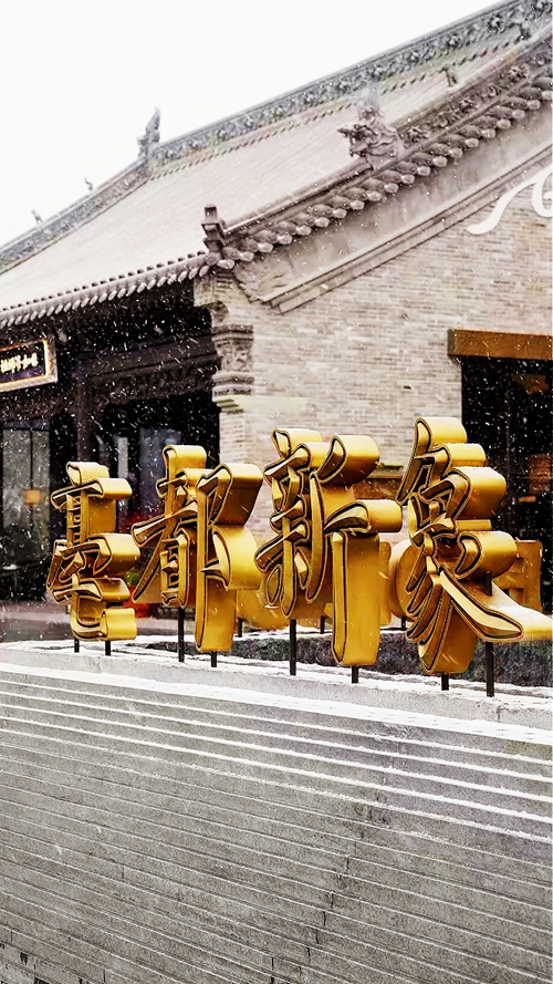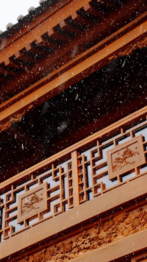 飛檐翹角綴滿蓬松雪團(tuán)
