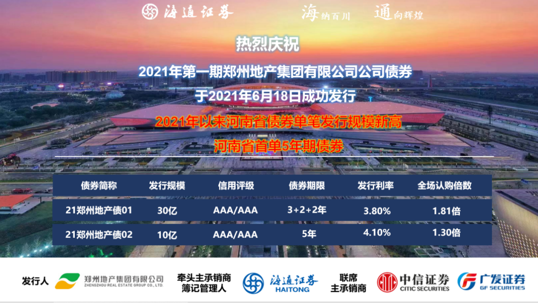 黨史學(xué)習(xí)教育在鄭州地產(chǎn)集團(tuán)如火如荼開(kāi)展,集團(tuán)黨委在鄭州市委、市政府的領(lǐng)導(dǎo)下,在鄭州市國(guó)資委黨委的監(jiān)管下,在學(xué)黨史、悟初心的基礎(chǔ)上,將“辦實(shí)事、解難題”作為黨史學(xué)習(xí)教育的重要內(nèi)容,充分釋放黨建紅色生產(chǎn)力,推進(jìn)黨史教育深入業(yè)務(wù)實(shí)踐,引領(lǐng)業(yè)務(wù)高質(zhì)量發(fā)展。在集團(tuán)黨委的堅(jiān)強(qiáng)領(lǐng)導(dǎo)下,鄭州地產(chǎn)集團(tuán)6月18日成功發(fā)行第一期優(yōu)質(zhì)企業(yè)債券40億元,3+2+2年期產(chǎn)品發(fā)行利率3.8%,5年期產(chǎn)品發(fā)行利率4.1%。本次發(fā)行創(chuàng)河南省首單5年期企業(yè)債券,創(chuàng)2021年以來(lái)河南省債券單筆發(fā)行規(guī)模新高,是鄭州地產(chǎn)集團(tuán)資本市場(chǎng)融資工具的又一創(chuàng)新探索!
