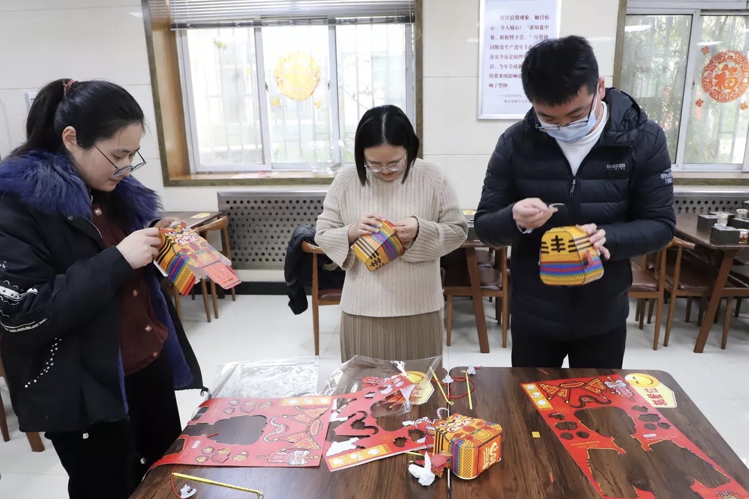 在DIY手工燈籠制作時(shí),大家各自拿著半成品材料對照參考說明進(jìn)行粘貼制作。相互交流、相互指導(dǎo),通過一步步的搭建、固定、粘貼,最終象征著喜慶、團(tuán)圓的萌虎燈籠逐一呈現(xiàn)眼前。